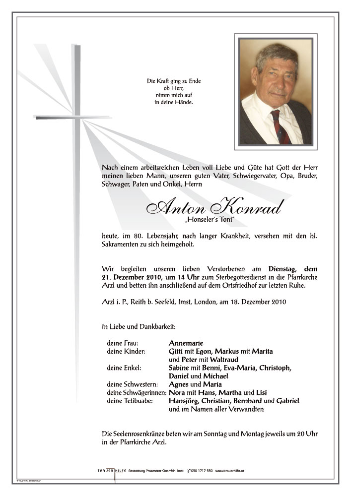 Anlässlich des Heimganges Ihres lieben TONI