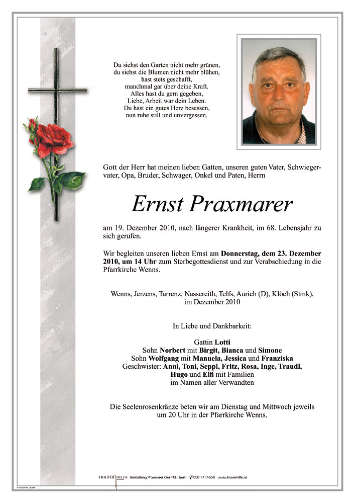 Ihr aufrichtiges Beileid entbieten Christian und Petra, Ernst und Helga, Michaela, Werner und Margreth21.12.2010 13:28 - Fam. Meringer, Schöpf und Gstrein