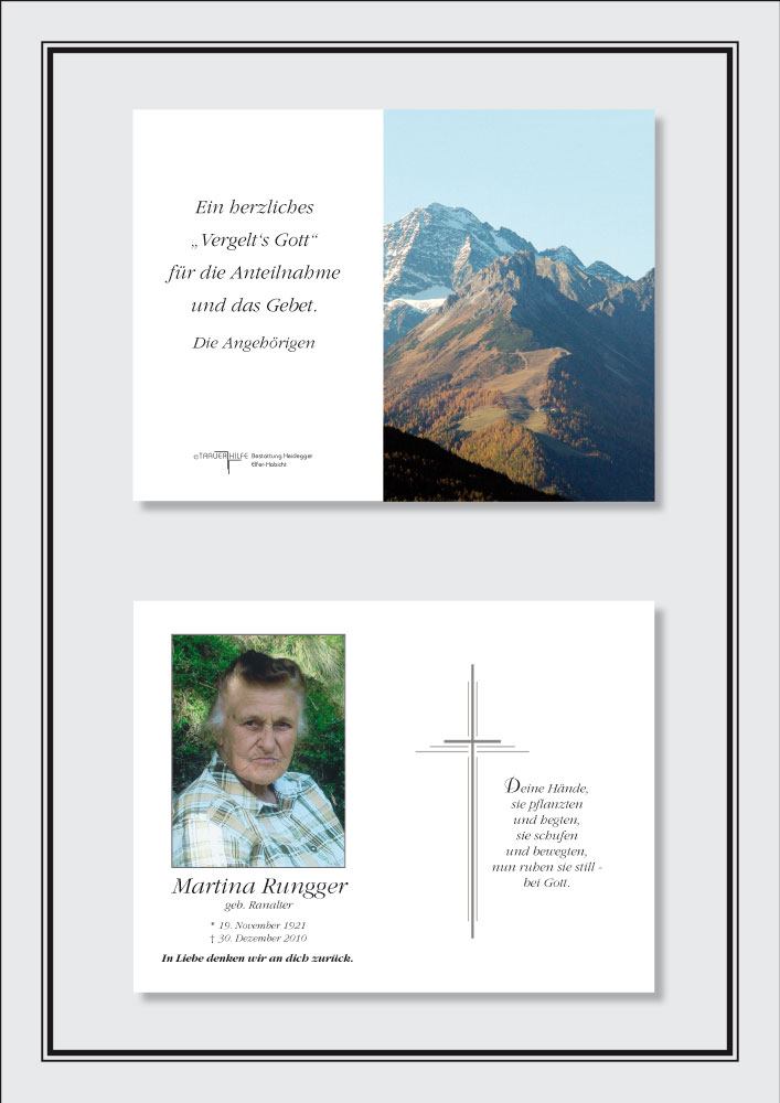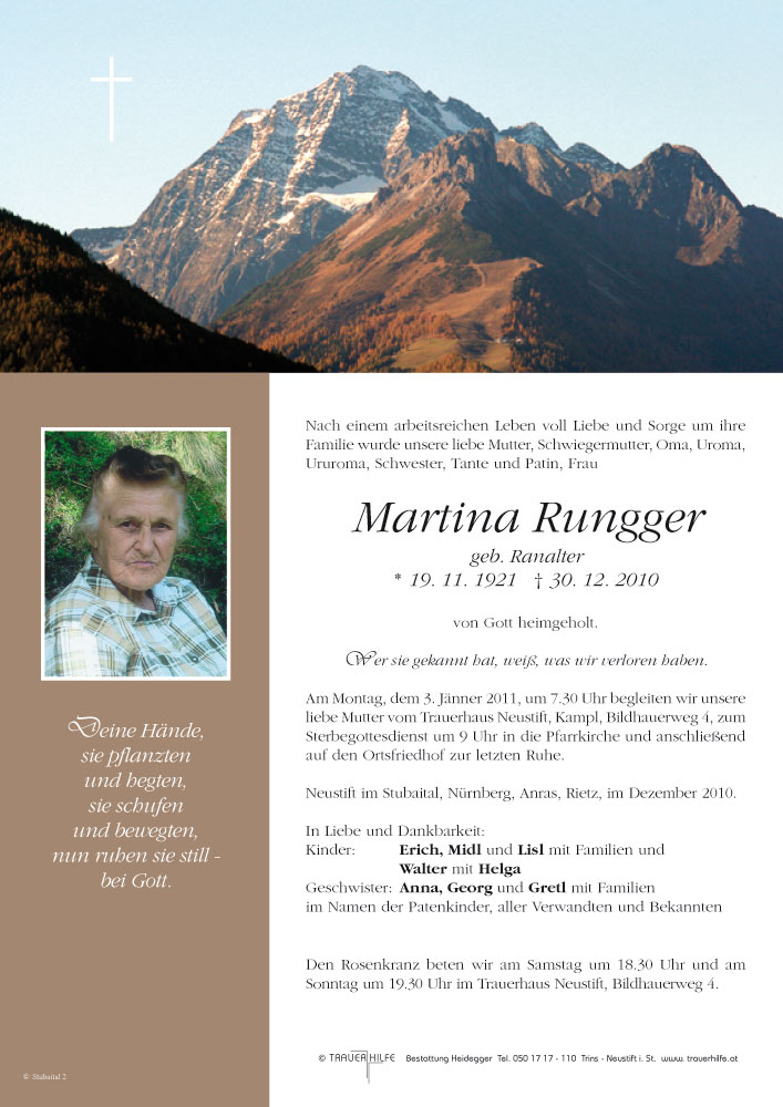 Bestattung wurde durchgeführt von: Karl Neurauter Karl Neurauter Bestattung Heidegger Brennerstraße 69 6150 - Steinach am Brenner Tel.: 05275 5211 zum Bestatter