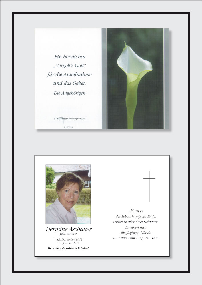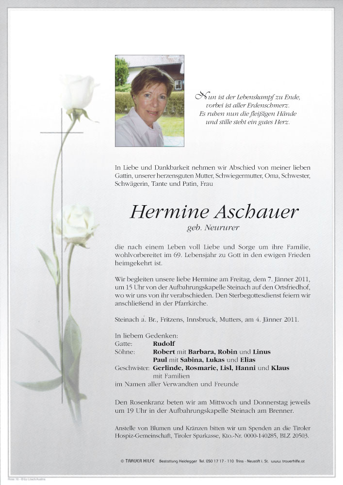 Bestattung wurde durchgeführt von: Karl Neurauter Karl Neurauter Bestattung Heidegger Brennerstraße 69 6150 - Steinach am Brenner Tel.: 05275 5211 zum Bestatter