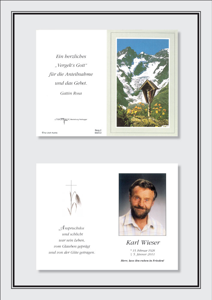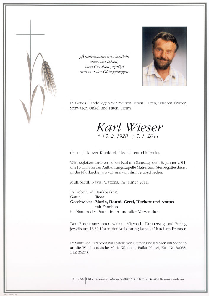 Bestattung wurde durchgeführt von: Karl Neurauter Karl Neurauter Bestattung Heidegger Brennerstraße 69 6150 - Steinach am Brenner Tel.: 05275 5211 zum Bestatter