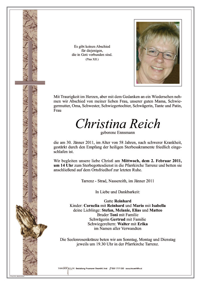 Für viele Dinge lohnt es sich im Leben zu kämpfen, um geliebte Menschen, eine Stellung und besonders um das eigene Leben. Lange hat dieser, dein letzter Kampf gedauert. Die Kraft war jetzt aufgebraucht. Der Herr nimmt dich in sein erlösendes, befreiendes Wirken auf. An die Hinterbliebenen, fragt nicht, hadert nicht, verzweifelt nicht. Seid dankbar, dass sie für euch war, ihr irdisches Wirken hat sich erfüllt, ihr Weg ist am Endpunkt angekommen. Christl, Ruhe in Frieden!