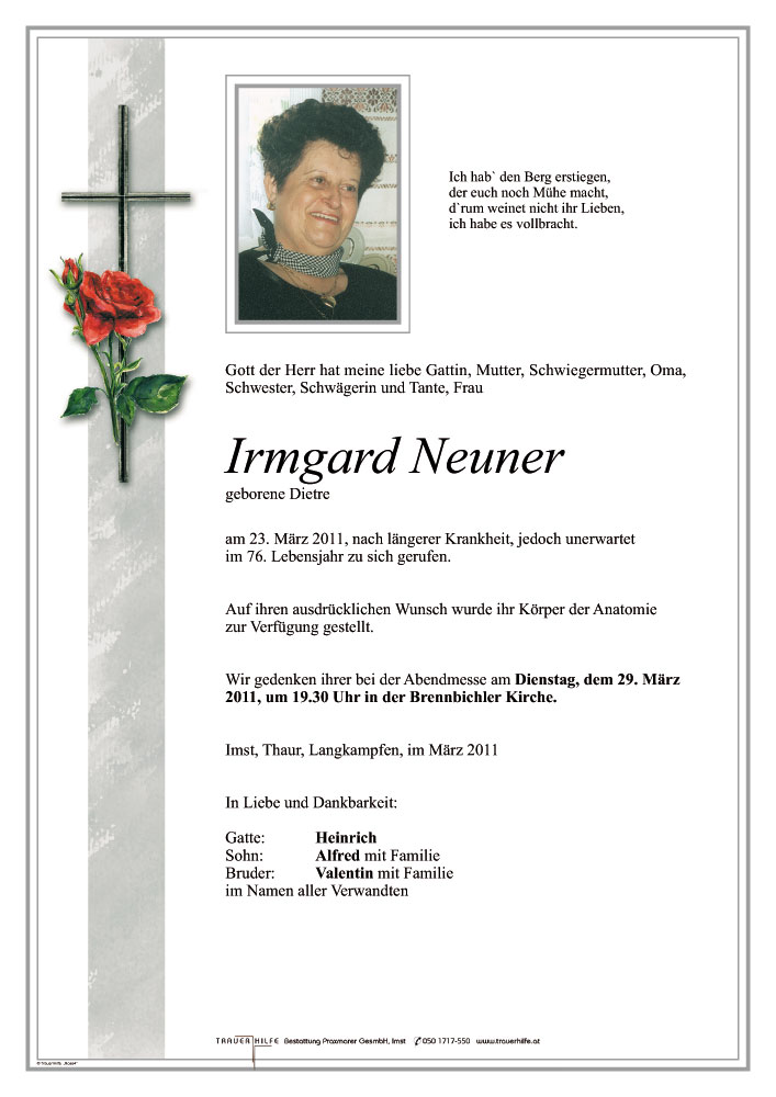 Bestattung wurde durchgeführt von: Daniel Klocker Bestattung Praxmarer GmbH Thomas Walch Str. 4 6460 - Imst Tel.: 05412 64250 zum Bestatter