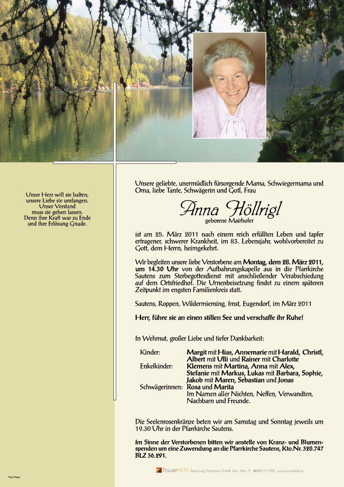 In Gedanken sind wir bei Euch und drücken Euch ganz fest.Nachstehend ein kleines Gebet für Eure Mama,die sich in Piburg immer so wohl gefühlt hat. " Liebe Anna!"