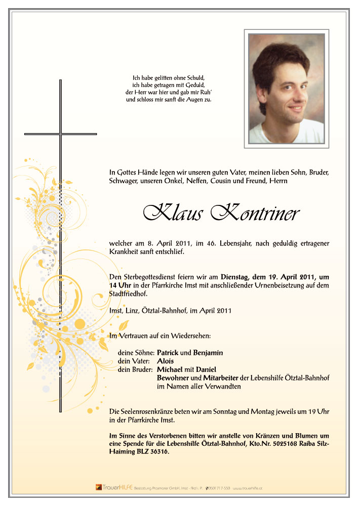 Bestattung wurde durchgeführt von: Daniel Klocker Bestattung Praxmarer GmbH Thomas Walch Str. 4 6460 - Imst Tel.: 05412 64250 zum Bestatter