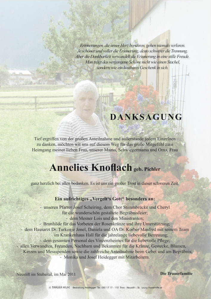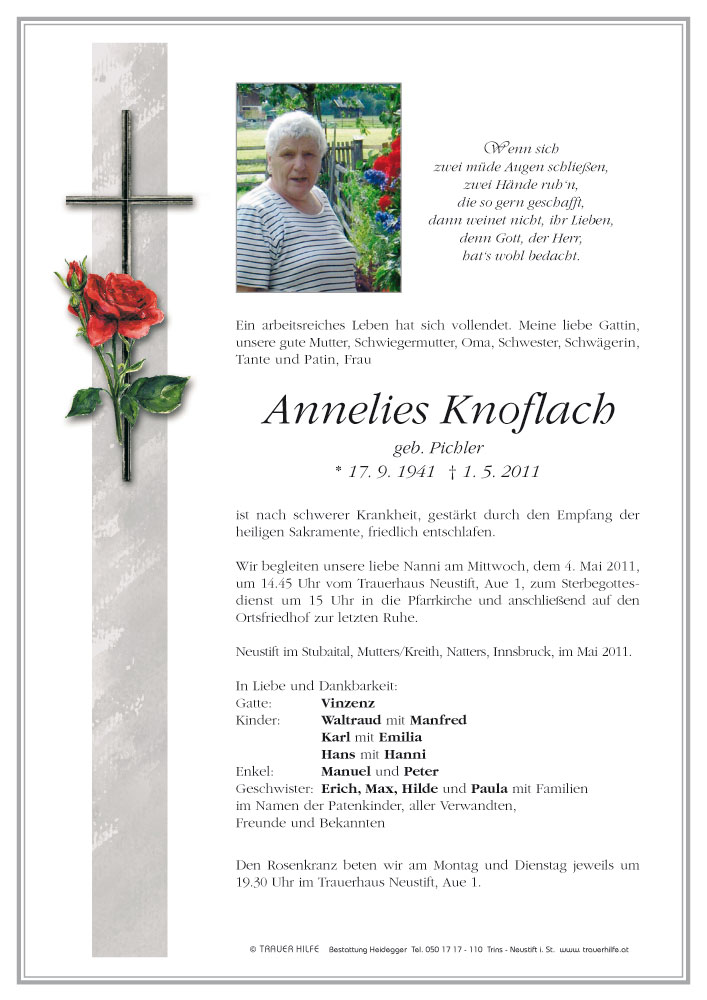 Bestattung wurde durchgeführt von: Karl Neurauter Karl Neurauter Bestattung Heidegger Brennerstraße 69 6150 - Steinach am Brenner Tel.: 05275 5211 zum Bestatter