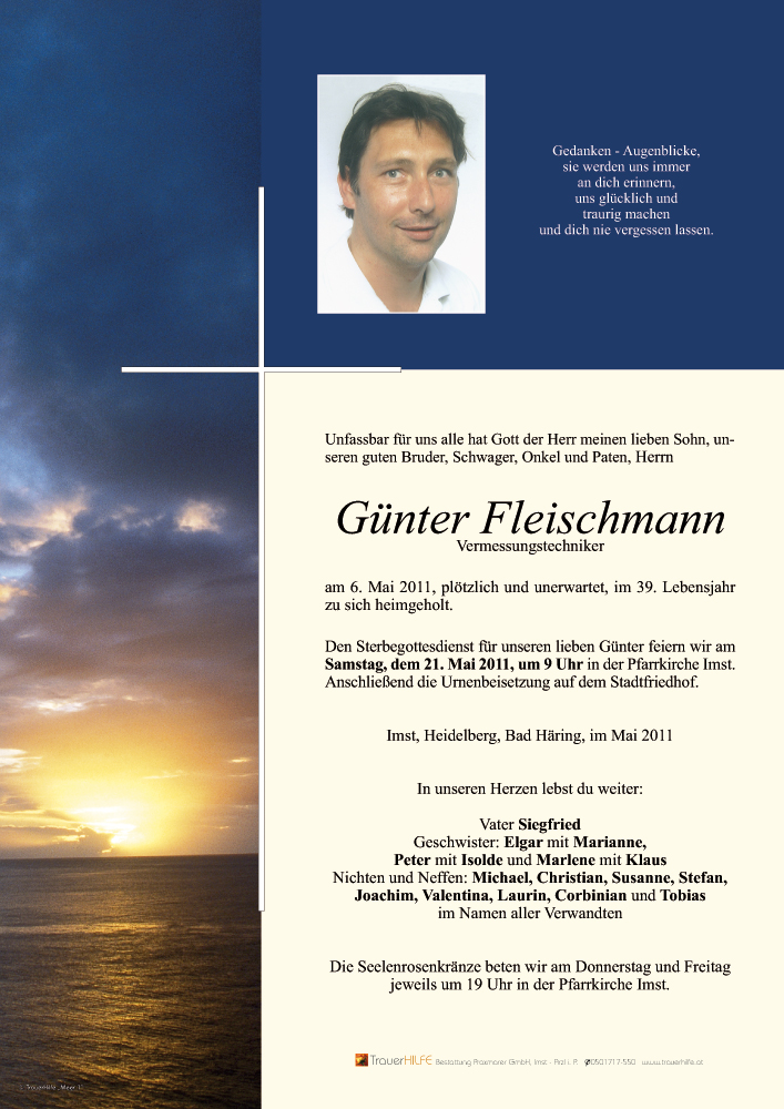 Lieber Günter, ein Blick zurück sagt mehr als tausend Worte es auszudrücken vermögen. Die Erinnerungen an unsere gemeinsame Kindheit, Fußball, Schifahren, an deine Schulzeit und als jugendlicher deine Freude an der Musik und deiner Gitarre. Und ein gemeinsamer Urlaub in Italien sind meine Lichtblicke, die in mir wieder wach werden.