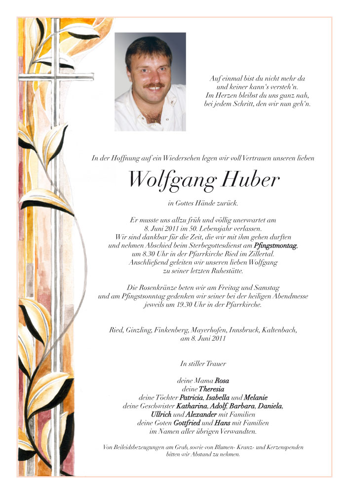 Voller Entsetzen habe ich heute vom Ableben eures geliebten Wolfgang gehört. Keine tröstenden Worte könnten euch nun den Schmerz des Verlustes mildern, dennoch soll es für euch ein Trost sein, dass ihr ihn mit Gewissheit wiedersehen werdet. Er ist nicht für immer weg, Wolfgang ist nur einen Raum weiter gegangen, in einen Raum voll von Licht, Sonne und Musik!
