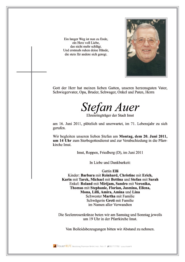 Mit Bestürzung habe ich heute vom Ableben Stefans erfahren. Er ist mir in den vielen, meist zufälligen, Zusammentreffen als freundlicher, aufrichtiger und hilfsbereiter Mensch entgegengetreten, der immer das Wohl der anderen vor das seine gestellt hat. Als Förderer des Breitensports in der Stadt Imst ist er zum Vorbild geworden und sein Wirken ist in vielen Sportstätten zu sehen - sein Sportsgeist soll uns allen ein Vorbild sein. Danke Stefan.