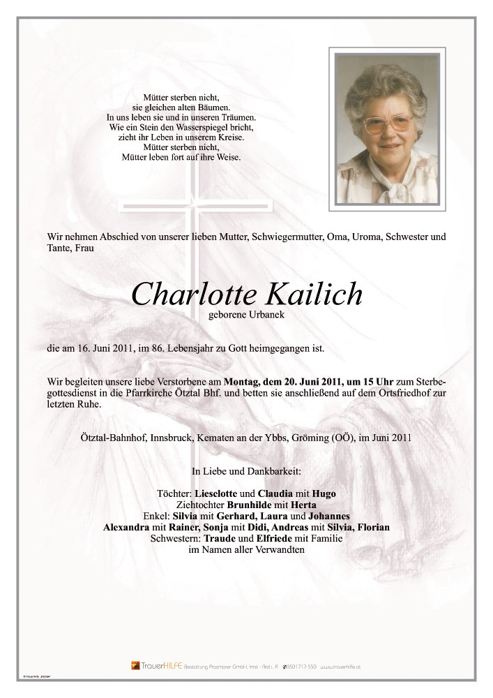 Anlässlich des Heimganges eurer lieben Mama und Oma möchten wir unser tiefstes Mitgefühl ausdrücken.