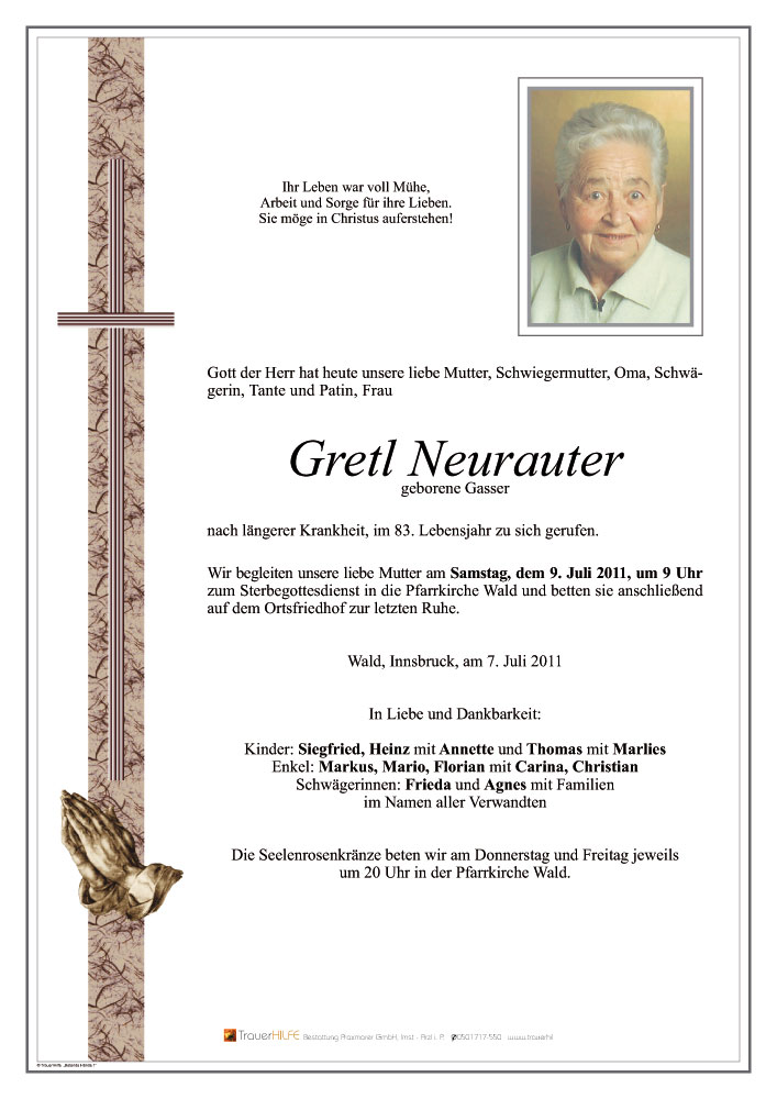 Bestattung wurde durchgeführt von: Daniel Klocker Bestattung Praxmarer GmbH Thomas Walch Str. 4 6460 - Imst Tel.: 05412 64250 zum Bestatter