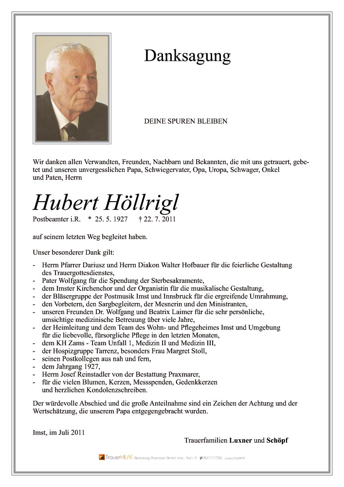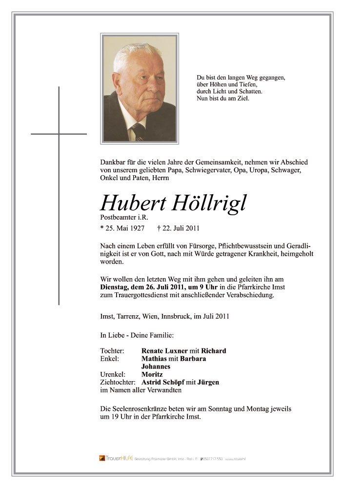aufrichte Anteilnahme wünsche ich Euch allen zum Heimgang Eures lieben Verstorbenen. Nicht nur als langjähigem Nachbarn habe ich Herrn Höllrigl zeitlebens sehr geschätzt. Ich werde ihn für immer in guter Erinnerung behalten!