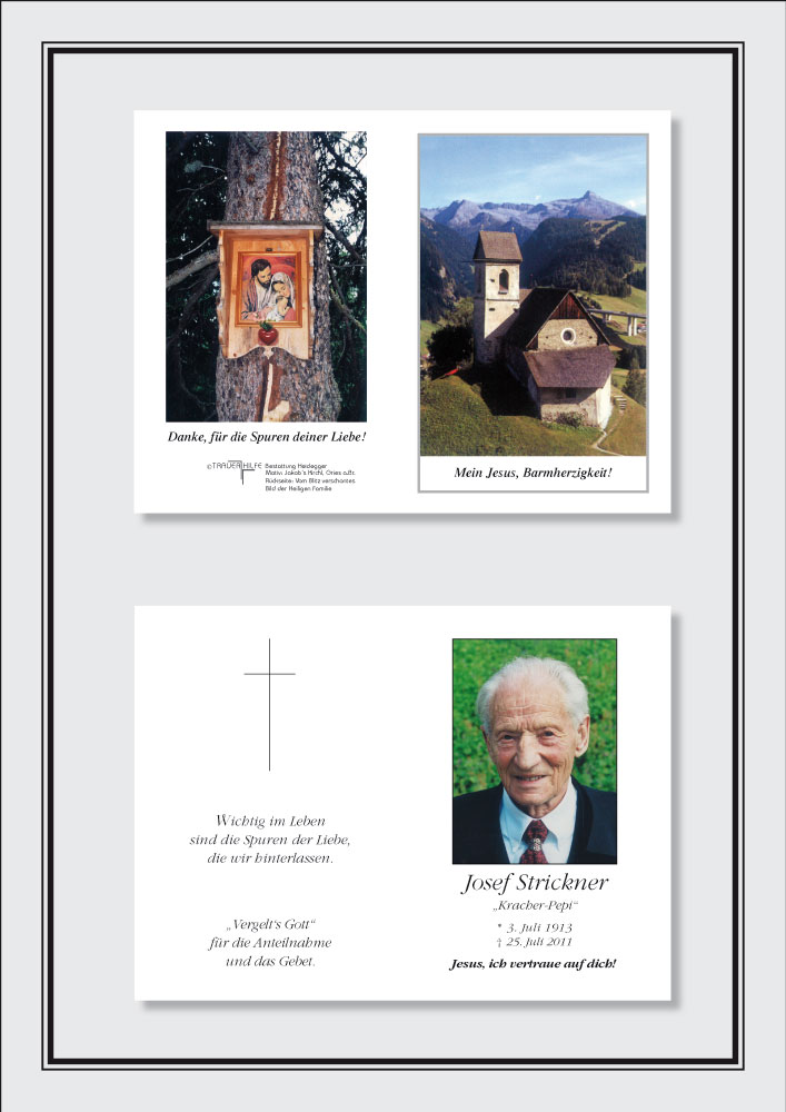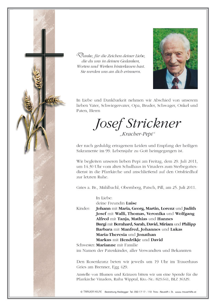 Bestattung wurde durchgeführt von: Karl Neurauter Karl Neurauter Bestattung Heidegger Brennerstraße 69 6150 - Steinach am Brenner Tel.: 05275 5211 zum Bestatter
