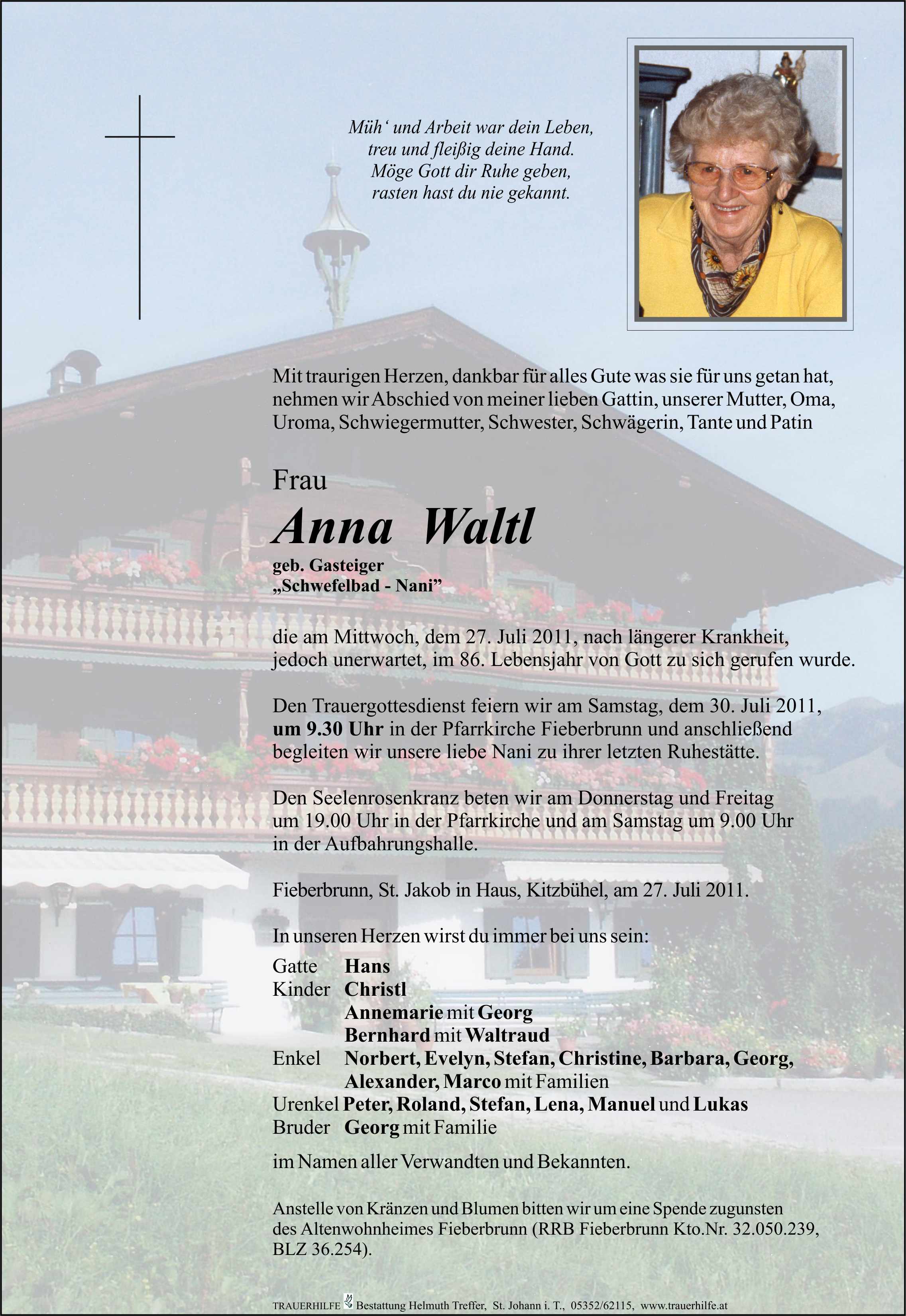 Bestattung wurde durchgeführt von: Bestattung St. Johann Huber-Sturm Bestattung St. Johann Huber-Sturm Bestattung St. Johann Huber-Sturm GmbH Salzburgerstraße 27 6380 - St. Johann in Tirol Tel.: 050 1717 190 zum Bestatter