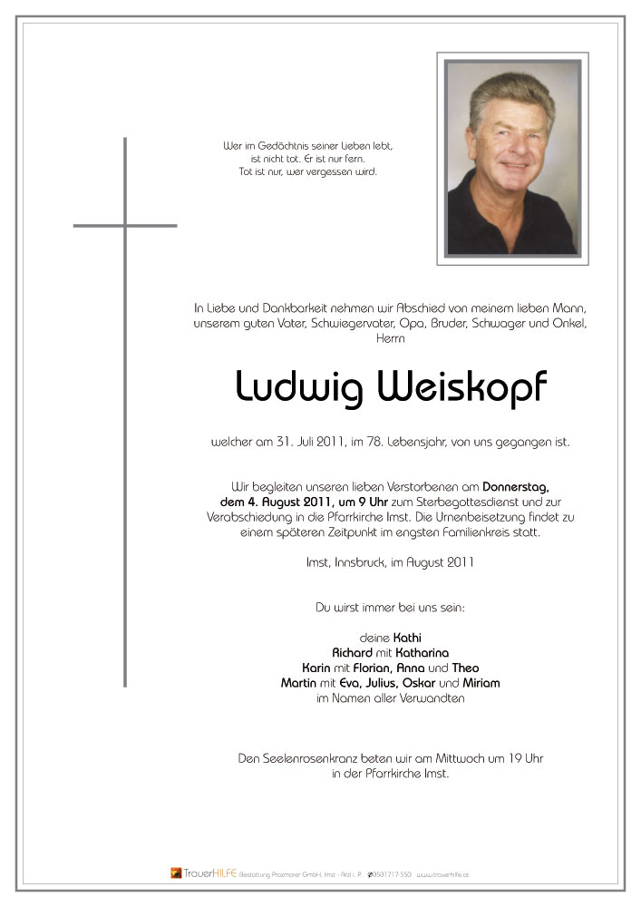 Bestattung wurde durchgeführt von: Daniel Klocker Bestattung Praxmarer GmbH Thomas Walch Str. 4 6460 - Imst Tel.: 05412 64250 zum Bestatter