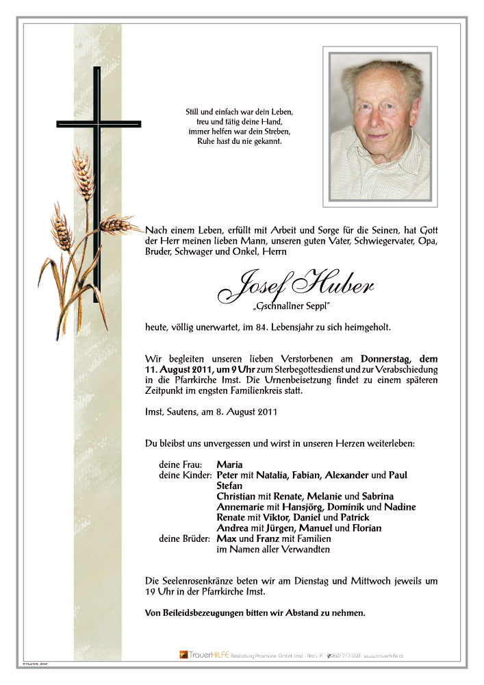 Auch auf diesem Weg möchte ich Euch nochmals viel Kraft und Segen wünschen. Ich habe Josef in sehr guter Erinnerung mit all seinem Bemühen um die Antoniuswallfahrten, der herzlichen Aufnahme der Ratschergruppen am Karfreitag und der liebevollen Pflege seiner Frau, des Bruders und Sohnes. Gott möge ihm all dss Gute vergelten, das er für die Vielen in Stille und Bescheidenheit getan hat.