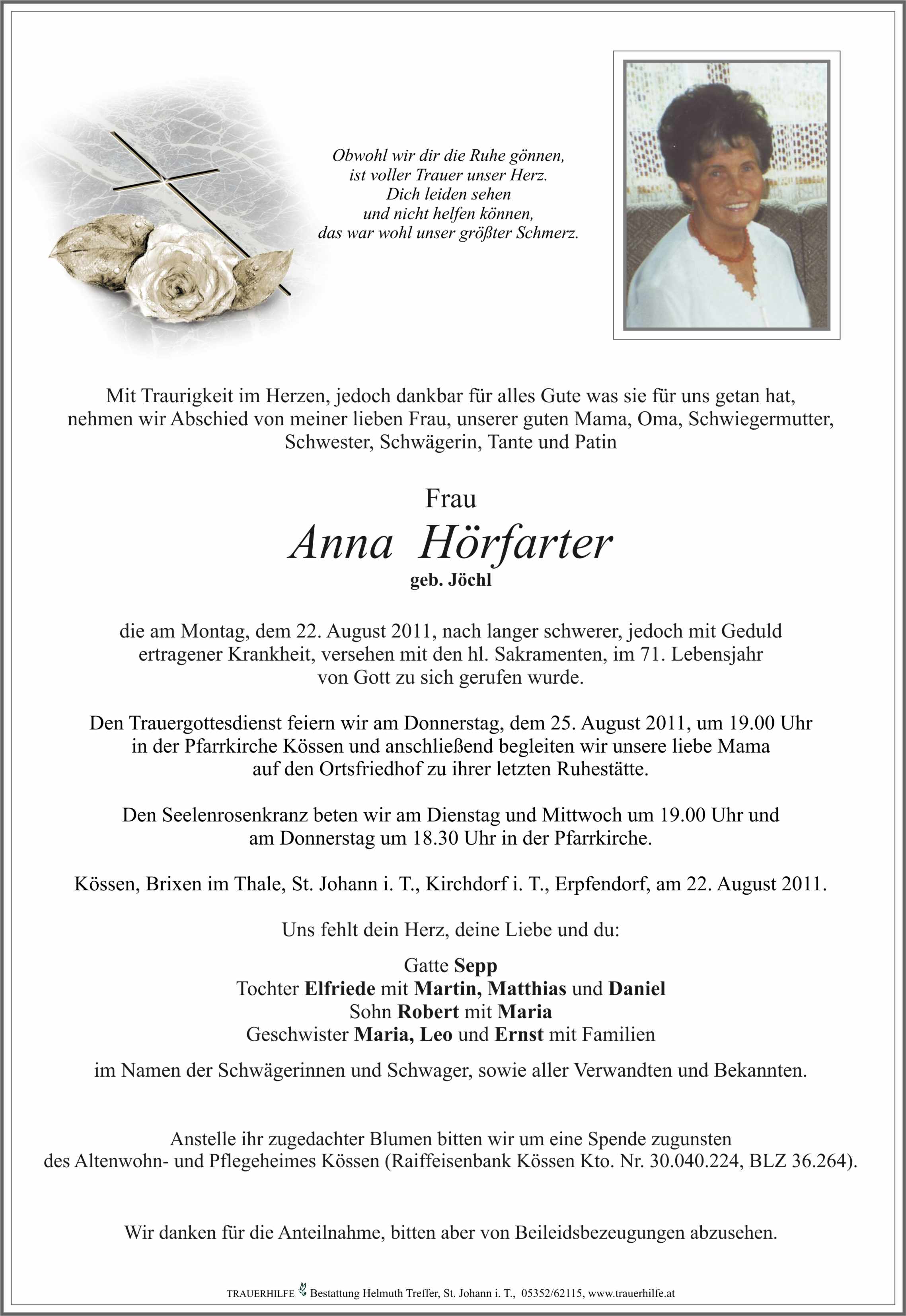 Bestattung wurde durchgeführt von: Bestattung St. Johann Huber-Sturm Bestattung St. Johann Huber-Sturm Bestattung St. Johann Huber-Sturm GmbH Salzburgerstraße 27 6380 - St. Johann in Tirol Tel.: 050 1717 190 zum Bestatter