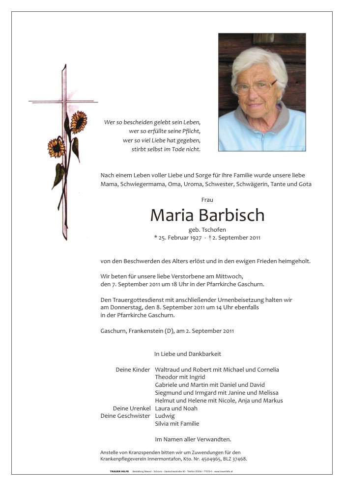 Bestattung wurde durchgeführt von: Peter Marent Bestattung Marent GmbH Gantschierstraße 80 6780 - Schruns Tel.: 05556 77070 zum Bestatter