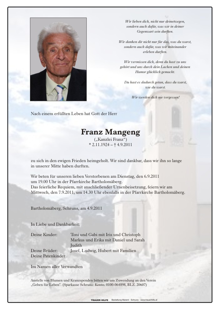 Bestattung wurde durchgeführt von: Peter Marent Bestattung Marent GmbH Gantschierstraße 80 6780 - Schruns Tel.: 05556 77070 zum Bestatter