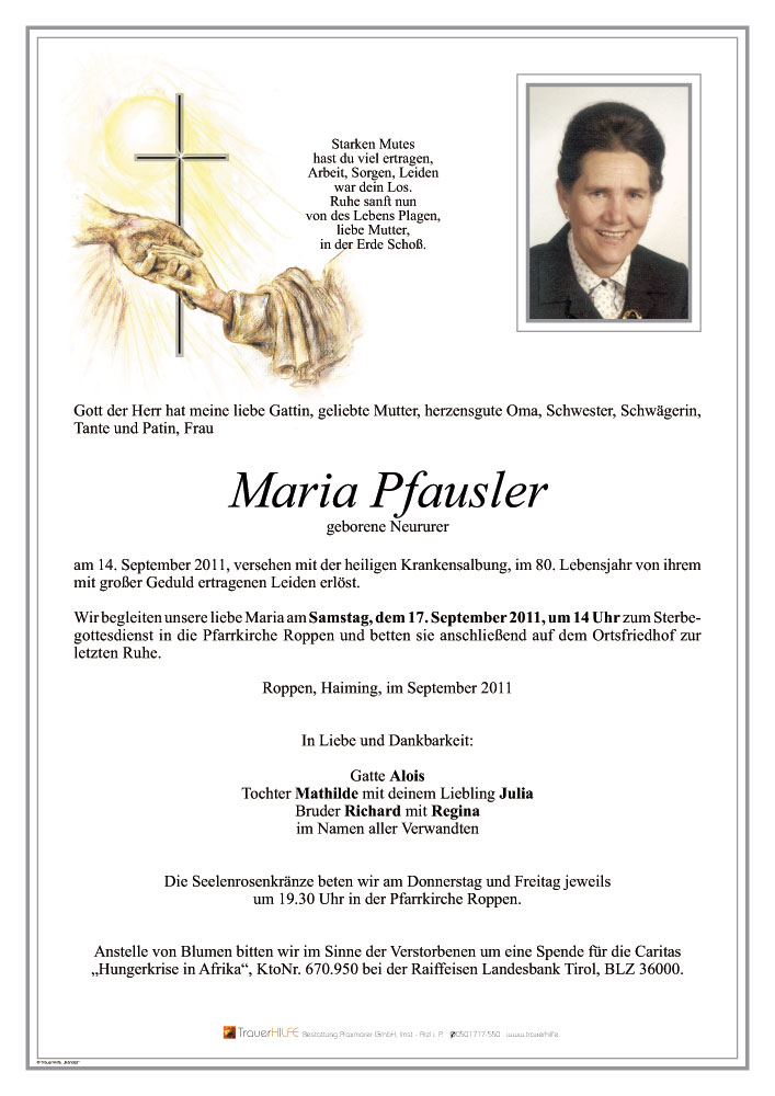 Ich wünsche Euch viel Kraft und Segen anlässlich des Heimganges Deiner Frau und Mutter. Ich kann mich an die vielen gastfreundlichen Aufnahmen auf Eurem Bauernhof in Roppen erinnern, während der Zeit als Ortsbauernobmann von Alois und an so manche Gespräche von Maria mit Mathilde vor der Kapuzinerkirche Imst. Alles Liebe Euch. Andreas