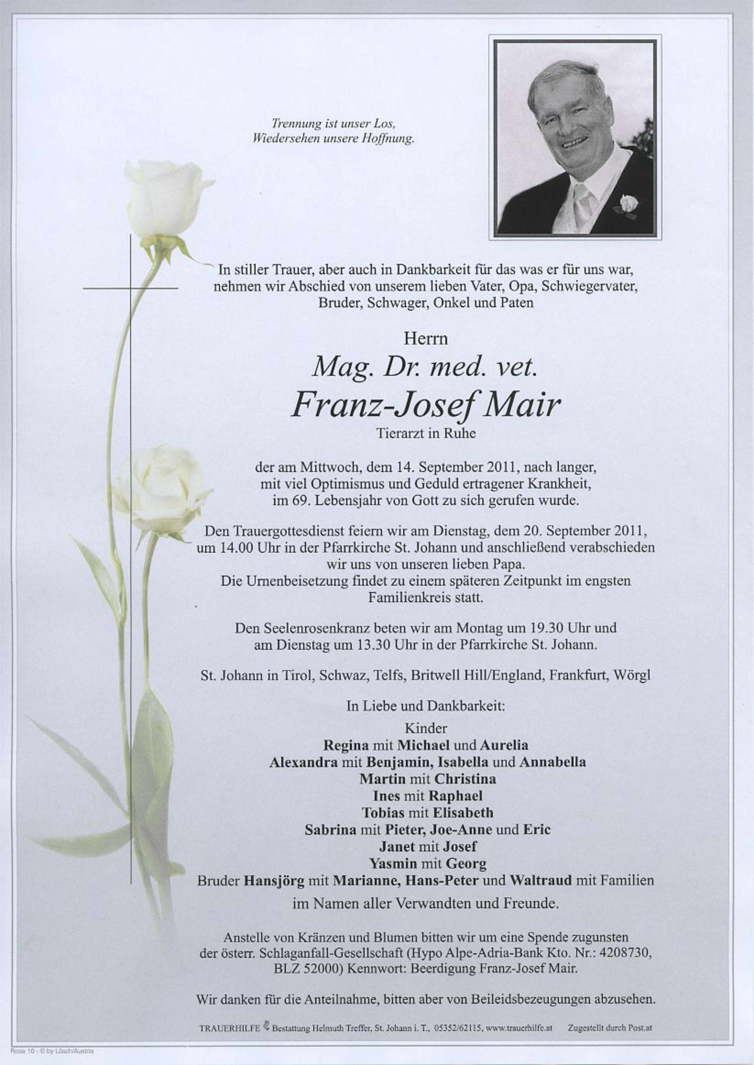 Bestattung wurde durchgeführt von: Bestattung St. Johann Huber-Sturm Bestattung St. Johann Huber-Sturm Bestattung St. Johann Huber-Sturm GmbH Salzburgerstraße 27 6380 - St. Johann in Tirol Tel.: 050 1717 190 zum Bestatter