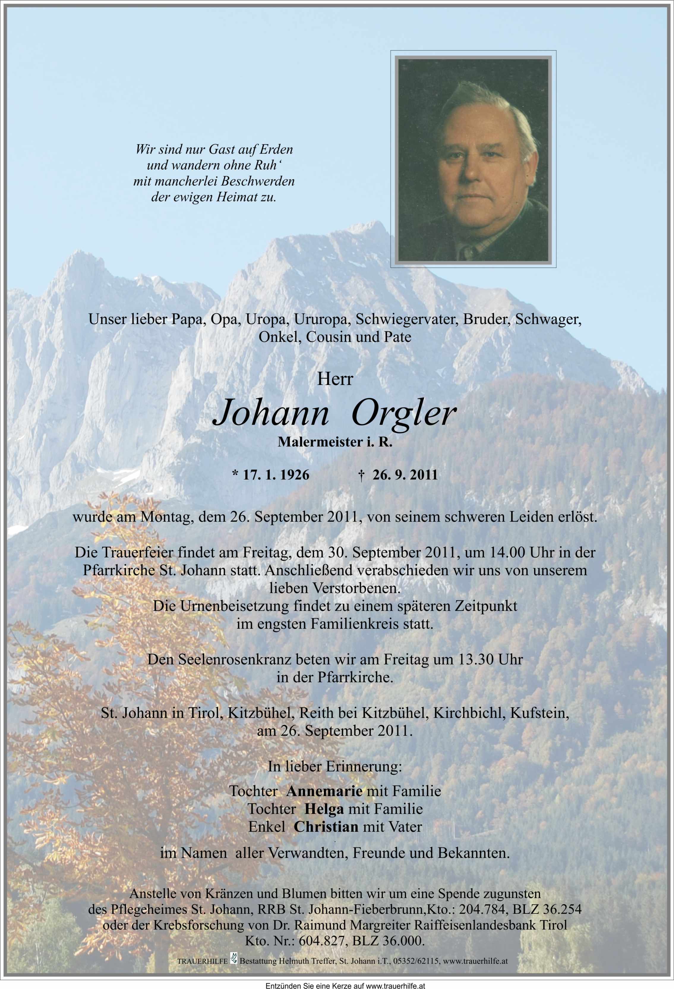 Neue Kerze für Johann Orgler entzünden.