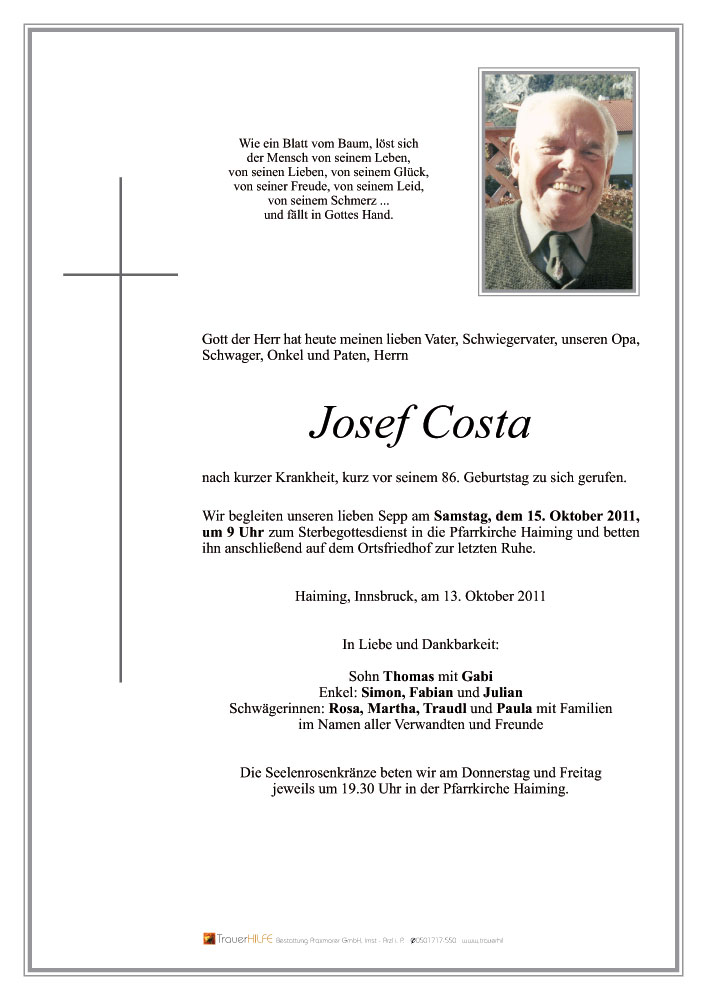 Wir wünschen Euch viel Kraft in den schweren Stunden! Hätte gerne noch mit Onkel Sepp unseren gemeinsamen Geburtstag gefeiert!13.10.2011 18:57 - Monika, Jamie und Christoph
