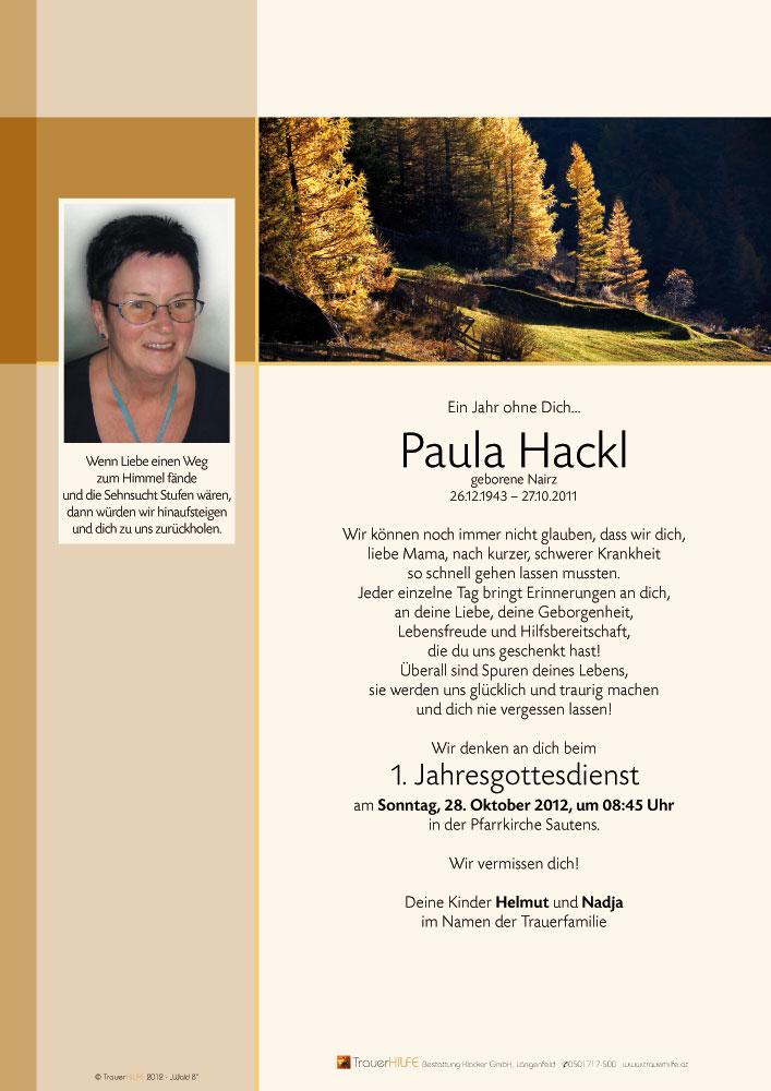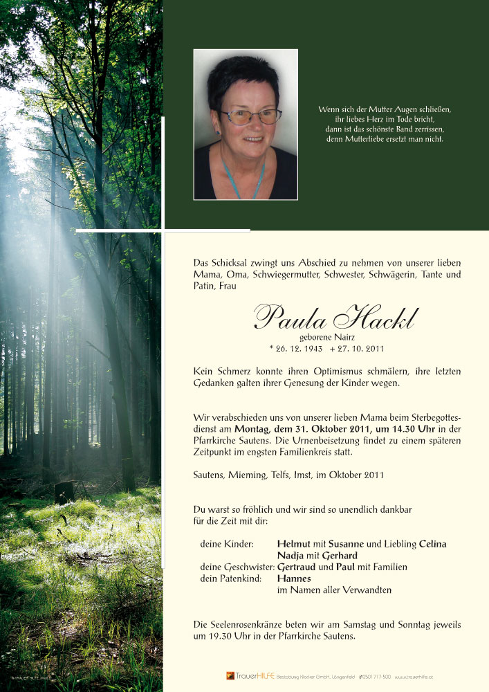 Aufrichtige Anteilnahme entbieten Annemarie Raggl und Hanni Auer geb.Maurer (Sautner)mit Familien28.10.2011 18:41 - Raggl Annemarie