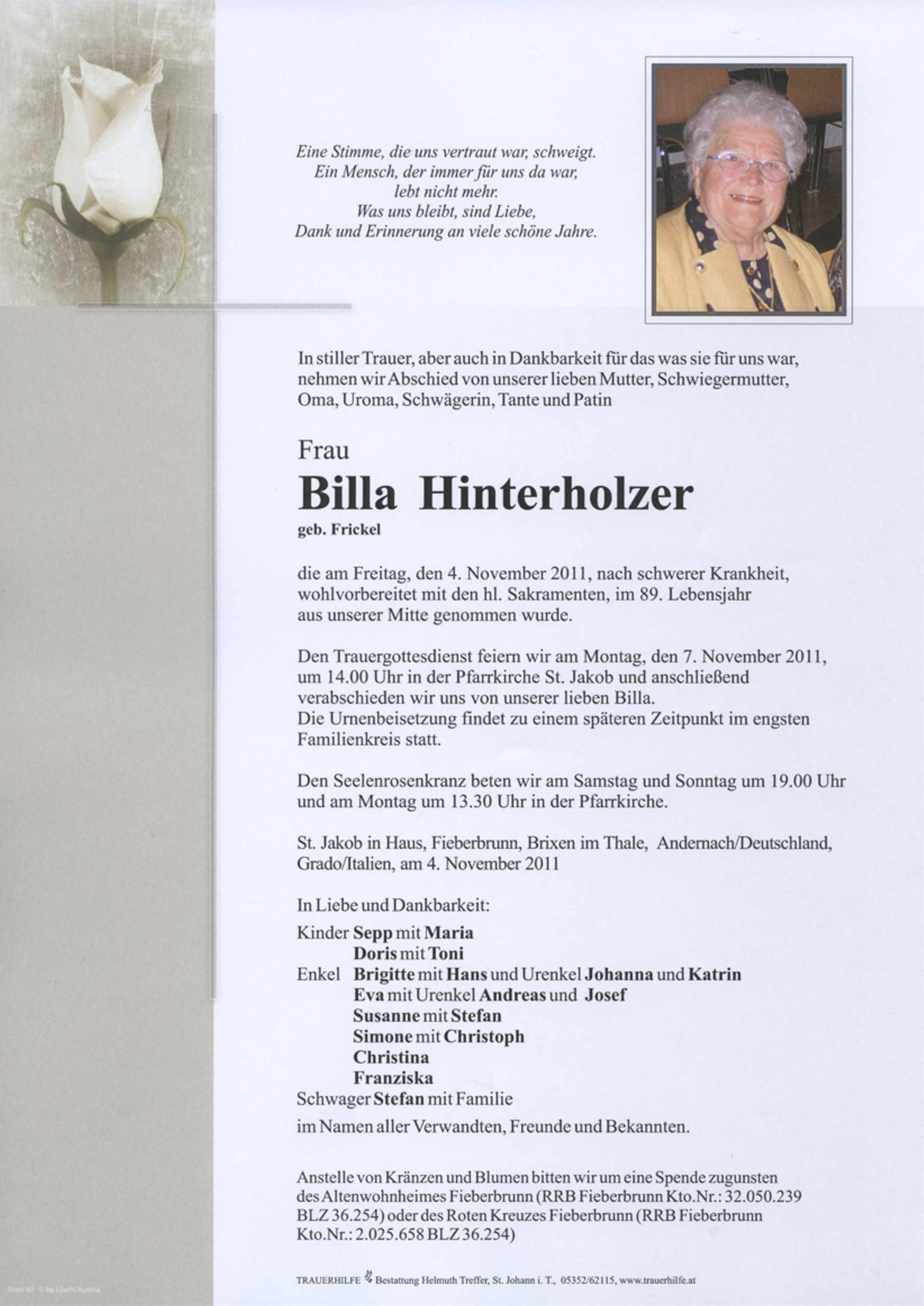 Aus eigener leidvoller Erfahrung weiß ich, wie es ist, die Mutter zu verlieren. Wir wünschen Euch ganz viel Kraft! Wir werden Tante Billa immer in lieber Erinnerung behalten!05.11.2011 11:34 - Inge und Reinhard Hinterholzer