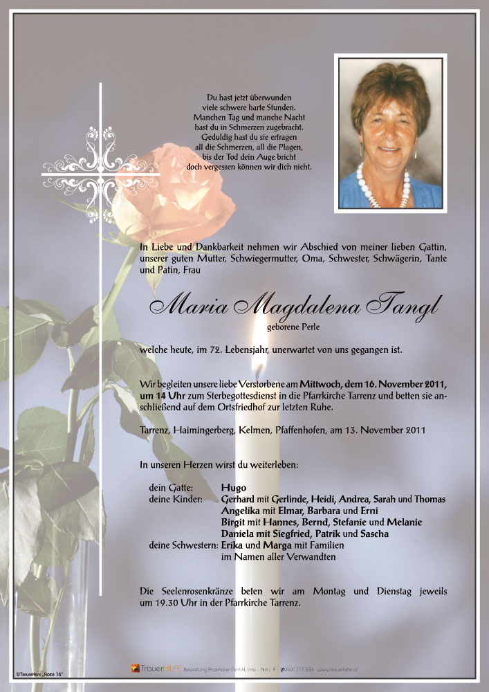 Ich wünsche Euch viel Kraft und Segen zur Bewältigung Eures Heimganges Deiner Frau und Eurer Mutter. Ich sehe sie vor mir, wie sie immer wieder über die Landwirtschaft und die Kinder gesprochen hat. Andreas14.11.2011 22:40 - Diakon Andreas Sturm, Imst