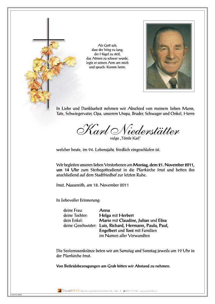 Bestattung wurde durchgeführt von: Daniel Klocker Bestattung Praxmarer GmbH Thomas Walch Str. 4 6460 - Imst Tel.: 05412 64250 zum Bestatter