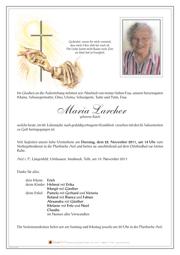 Bestattung wurde durchgeführt von: Daniel Klocker Bestattung Praxmarer GmbH Thomas Walch Str. 4 6460 - Imst Tel.: 05412 64250 zum Bestatter
