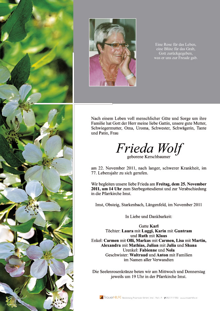 in der schweren Stunde des Abschiedes von Deiner lieben Frau Frieda entbieten wir Dir lieber Karl, unser aufrichtiges Mitleid und wünschen Euch Allen viel Kraft für die schweren Stunden.