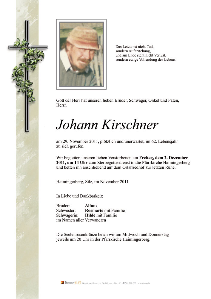 Bestattung wurde durchgeführt von: Daniel Klocker Bestattung Praxmarer GmbH Thomas Walch Str. 4 6460 - Imst Tel.: 05412 64250 zum Bestatter
