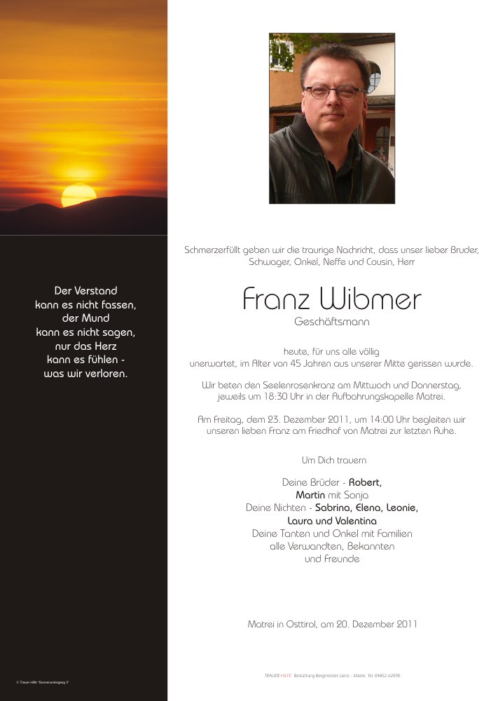 Zum plötzlichen Tod eures Bruders Franz möchten wir unser tiefstes Mitgefühl aussprechen! Gott gebe euch Kraft in dieser schweren Zeit! Die Sonne soll euch wärmen und eure Tränen trocknen!