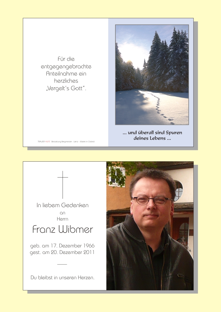 Wir, die Schulkameraden der Klasse 4a, Jahrgang 1981, in der Franz unser Mitschüler war, möchten euch auf diesem Wege unser aufrichtiges Beileid ausdrücken. Es ist für uns alle unfassbar und nicht vorstellbar, dass Franz nicht mehr sein sollte. Am 1. Oktober dieses Jahres hatten wir noch ein wunderschönes Klassentreffen im Goldried, bei dem der Franz dabei war. Jetzt wollte es das Schicksal, dass er nicht mehr unter uns ist.