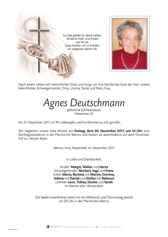 Unser aufrichtiges Beileid und tiefes Mitgefühl zum Heimgang Eurer lieben Mama und meiner Gotl Agnes