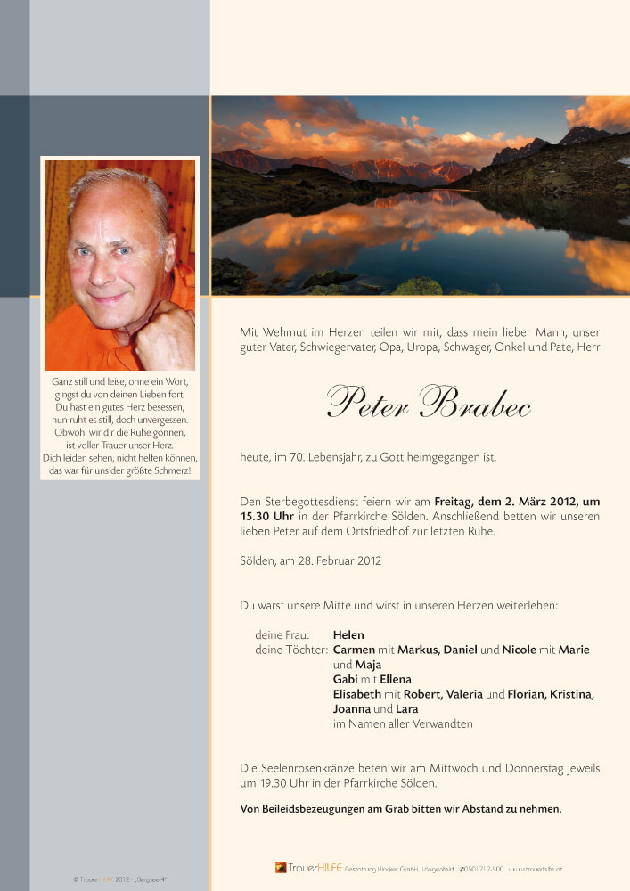 Ich werde euren Peter so in Erinnerung behalten, wie ich ihn erleben durfte. Als aufrichtigen, fleißigen und stets korrekten Menschen.