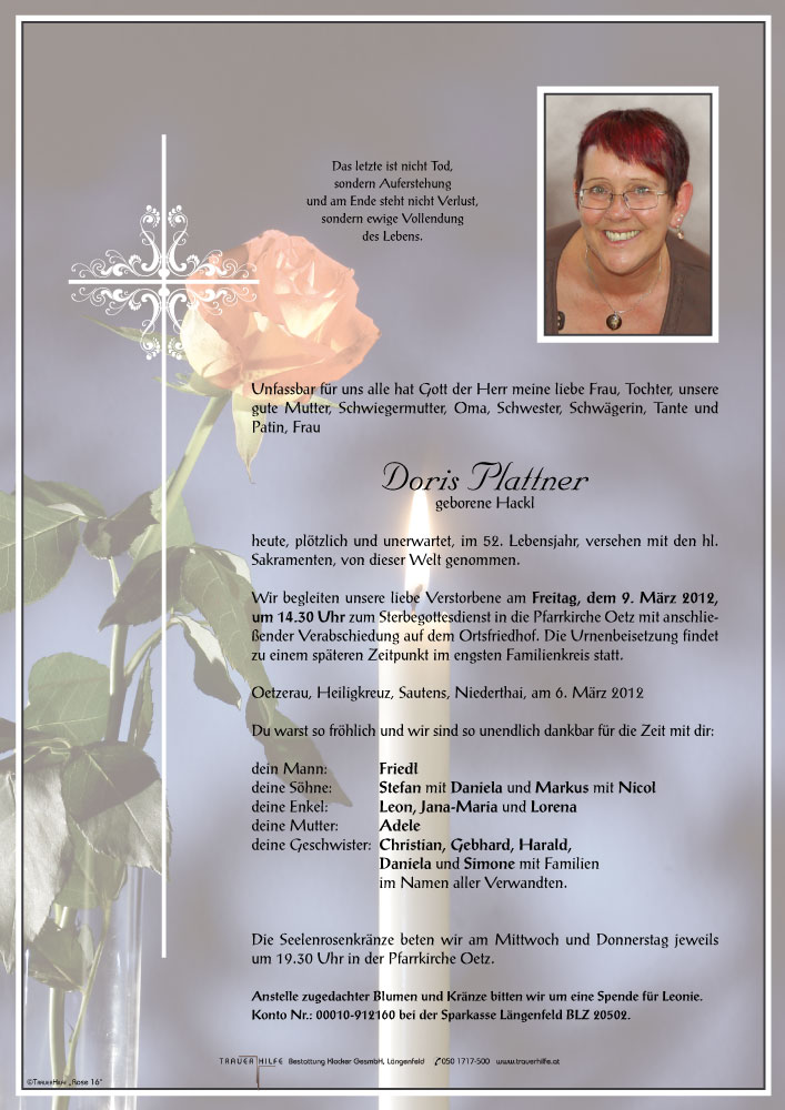 Lieber Friedel Markus mit Nicol und Stefan mit Daniela,Adele mit Christian ,Harald ,Gebhard ,Daniela und Simone...WIR sind unendlich traurig in dieser schweren Stunde des ABSCHIEDNEHMENS von DORIS nicht bei EUCH sein zu können.Mit unseren HERZEN sind wir euch und allen die um DORIS trauern nahe...WIR gedenken IHR in LIEBE und DANKBARKEIT...EURE SABINE ,BABIS,UND ANGELIKI...