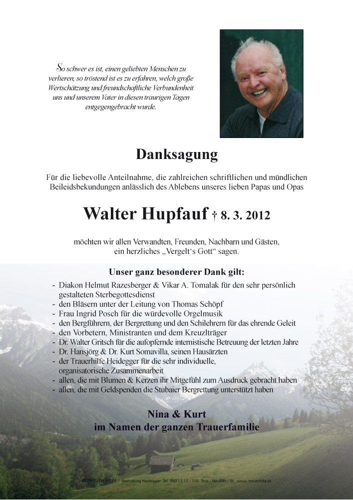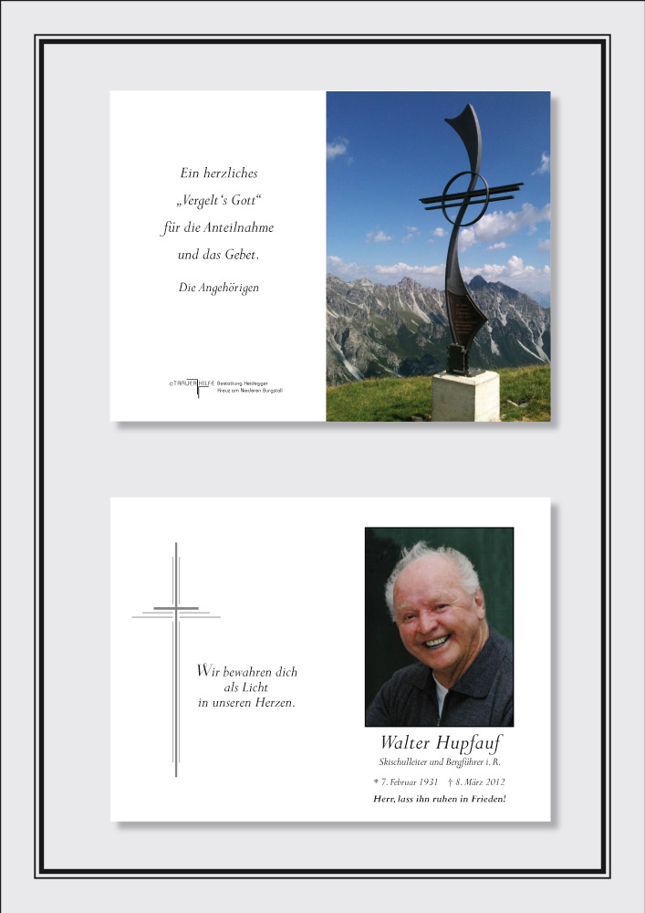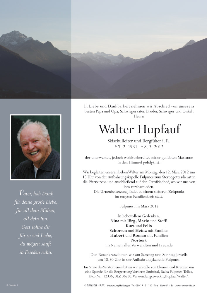 Bestattung wurde durchgeführt von: Karl Neurauter Karl Neurauter Bestattung Heidegger Brennerstraße 69 6150 - Steinach am Brenner Tel.: 05275 5211 zum Bestatter