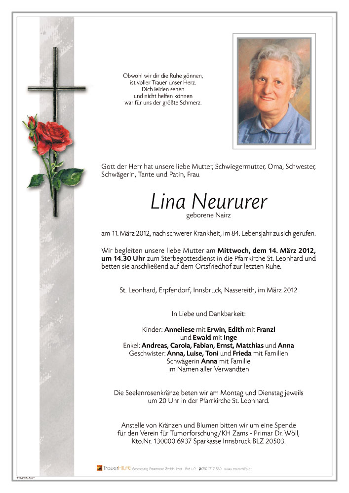Lieber Ewald, liebe Inge, geschätzte Trauerfamilie. Lina ist uns in den vergangenen Jahren sehr ans Herz gewachsen - auch uns fällt das Abschied nehmen schwer. Trost gibt uns die Tatsache, dass der Tod für Lina eine große Erlösung war. Lina bleibt in unseren Herzen!