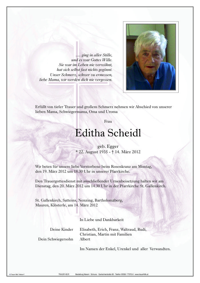 Bestattung wurde durchgeführt von: Peter Marent Bestattung Marent GmbH Gantschierstraße 80 6780 - Schruns Tel.: 05556 77070 zum Bestatter