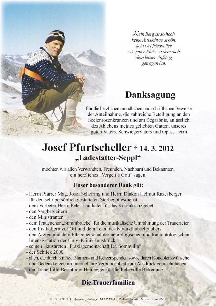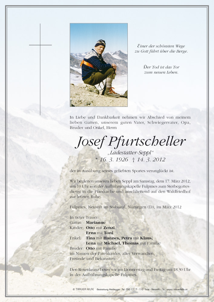 Bestattung wurde durchgeführt von: Karl Neurauter Karl Neurauter Bestattung Heidegger Brennerstraße 69 6150 - Steinach am Brenner Tel.: 05275 5211 zum Bestatter