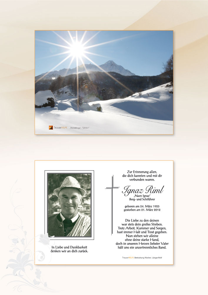 Bestattung wurde durchgeführt von: Daniel Klocker Bestattung Klocker GmbH Oberlängenfeld 41 6444 - Längenfeld Tel.: 05253 5561 zum Bestatter