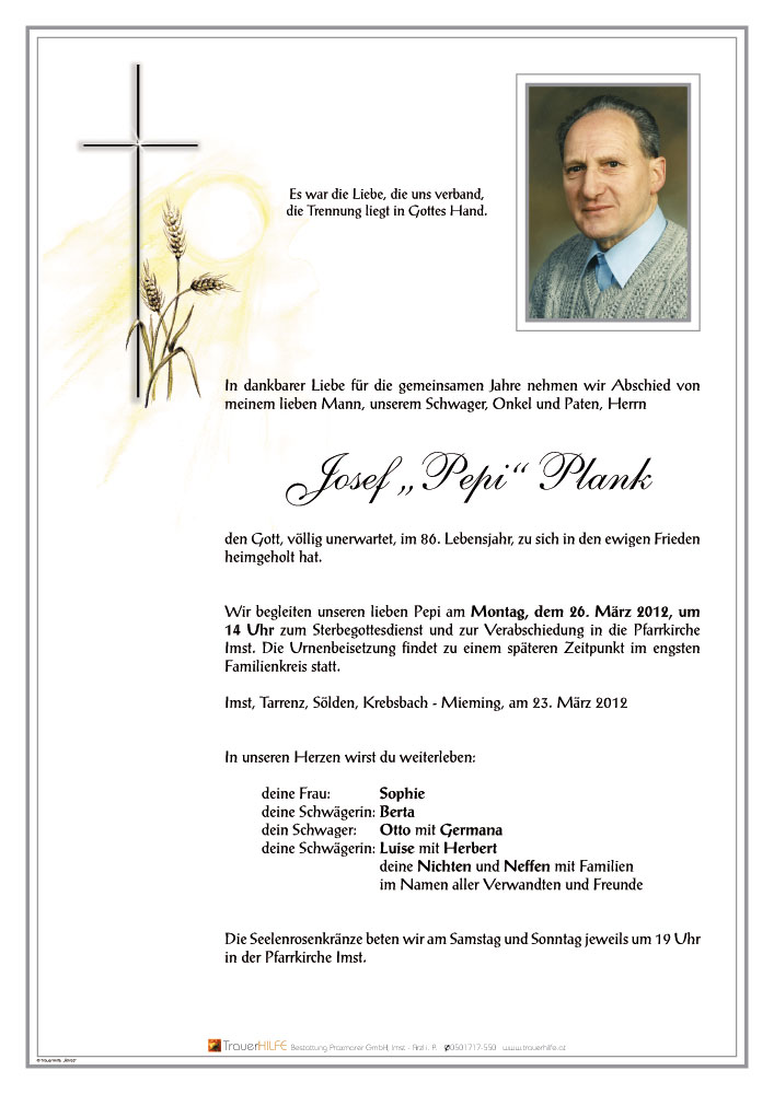 Bestattung wurde durchgeführt von: Daniel Klocker Bestattung Praxmarer GmbH Thomas Walch Str. 4 6460 - Imst Tel.: 05412 64250 zum Bestatter