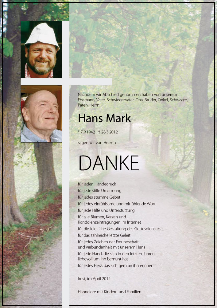 Liebe hannelore, liebe Familie Mark! In Stillem Gedenken an Hans & in Gedanken bei Euch!29.03.2012 20:50 - Johanna Heumader-Schweigl