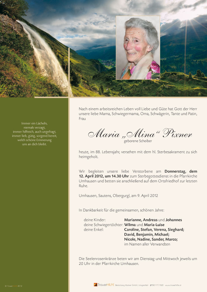 Aufrichtiges Beileid am Tode Eurer lieben Mutter und Oma entbieten Familie Scharfetter Gasthof Andreas Hofer Umhausen.10.04.2012 13:28 - Familie Scharfetter Umhausen