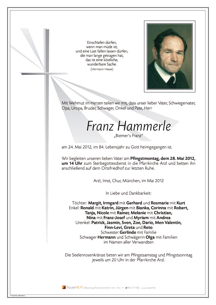 Bestattung wurde durchgeführt von: Daniel Klocker Bestattung Praxmarer GmbH Thomas Walch Str. 4 6460 - Imst Tel.: 05412 64250 zum Bestatter