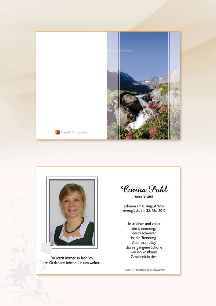 In der Blüte meines Lebens überraschte mich der Tod. Meine Lieben trauert nicht vergebens, denn das Schicksal kam von Gott. Wir sind ja noch verbunden durch ein Band das nie zerbricht. Liebe hält uns fest umwunden - denn die Liebe stirbt ja nicht.