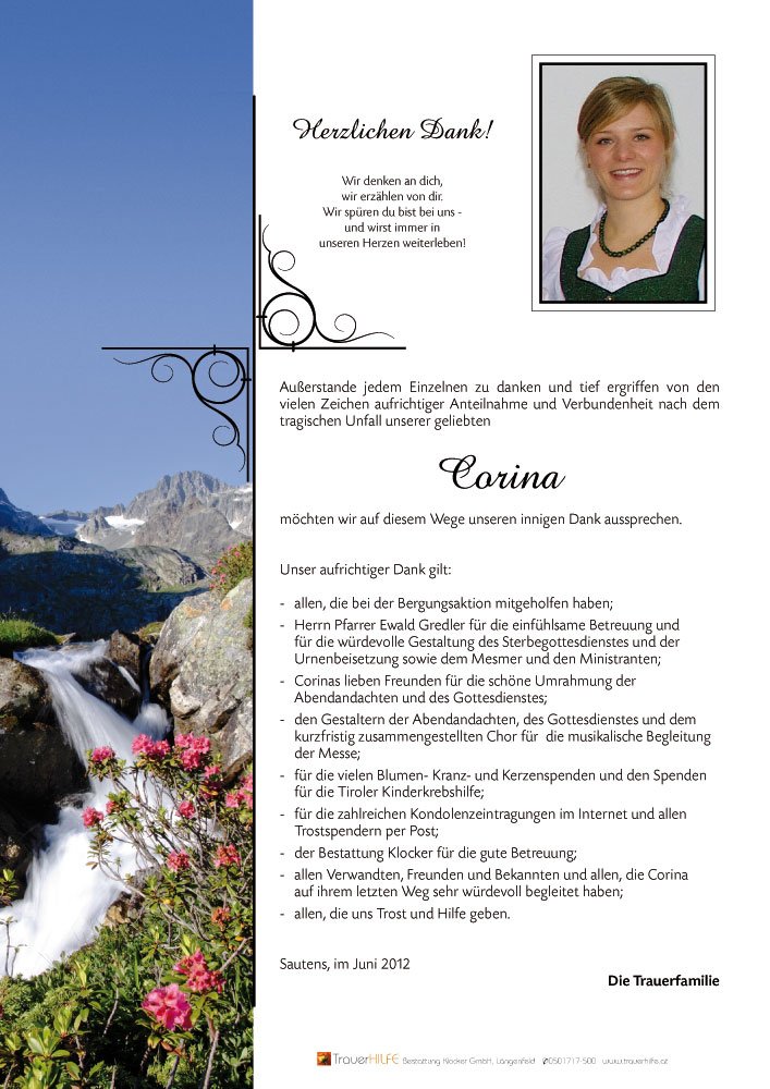 Ich wünsche den Angehörigen viel Kraft für die Zukunft, denn auch ich habe diese schreckliche Erfahrung, ein Kind zu verlieren, machen müssen. Seid aber dessen gewiß, sie ist ständig bei Euch, auch wenn Ihr sie nicht sehen könnt. Mich hat diese Erkenntnis auch getröstet. In Gedanken gehe ich mit Euch, auch wenn ich Corina nicht persönlich kannte, aber wir waren als Bergwanderführer Kollegen.